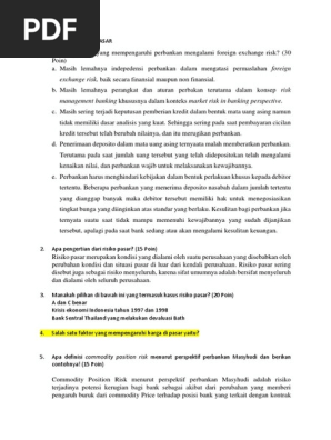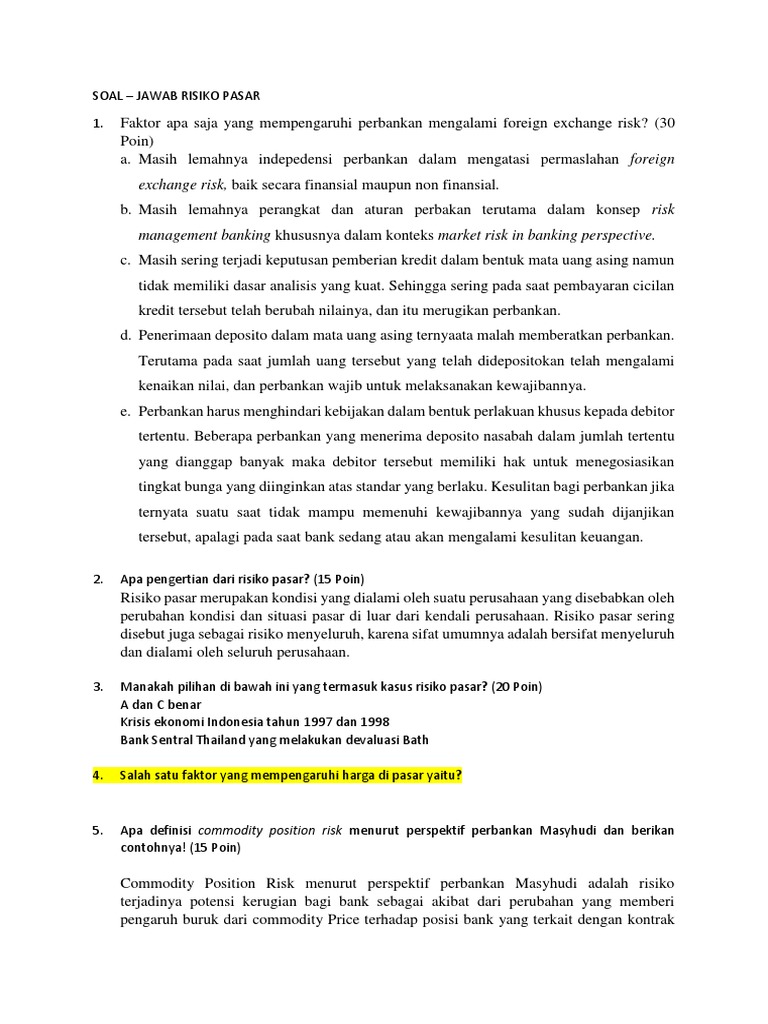 Soal Risiko Perbankan Pdf from imgv2-2-f.scribdassets.com Soal dan jawaban pasar modal. Perubahan pasar akan mempengaruhi variabilitas return suatu investasi, dengan kata lain, merupakan risiko yang tidak dapat didiversefikasi. Shobrie h.w., se, cfa, cla, cphr, cptr. Sebenarnya, bukan hanya saham, investasi lain pun juga memiliki risiko dan butuh modal juga pengetahuan. Untuk melembagakan sistem manajemen risiko likuiditas yang efektif di organisasi anda, ikuti tiga langkah berikut: Namun, risiko dapat diperdagangkan dan unbundled hanya jika ia terputus dari underlying activity. Konsep risiko selalu tersirat dalam iso 9001, dengan mengharuskan organisasi untuk merencanakan proses dan mengelola bisnisnya untuk menghindari hasil yang tidak diinginkan. Sementara bagi orang yang agresif, risiko investasi di pasar modal dianggap tidak terlalu tinggi.